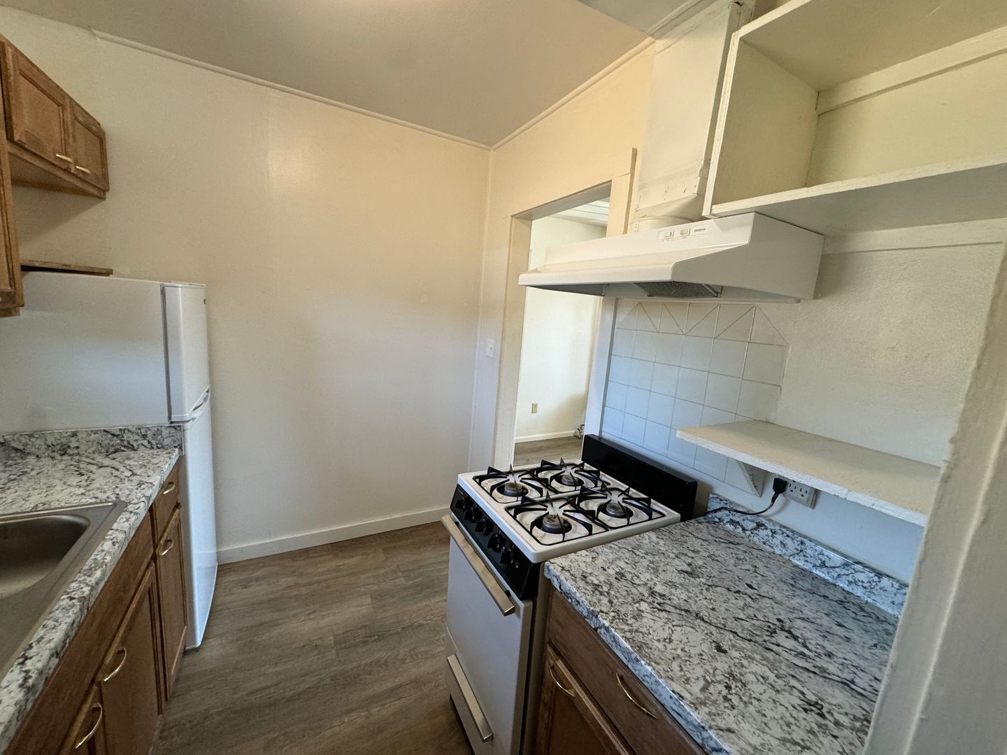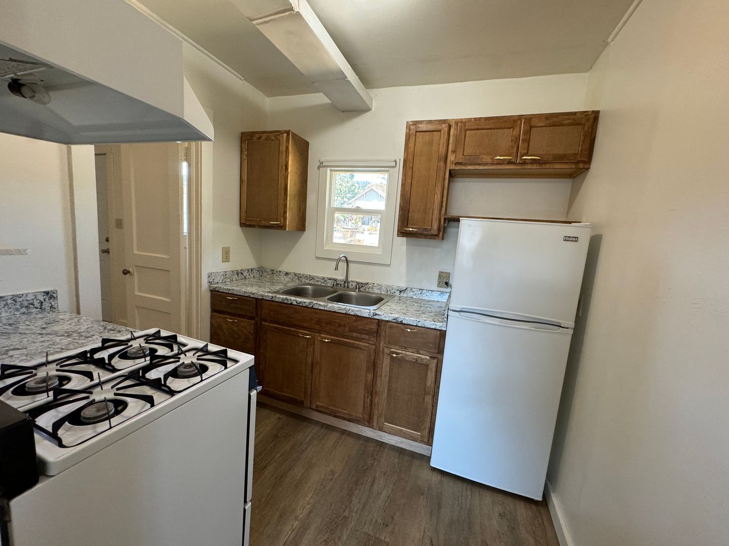 Quail Court 55 or older. Single level 2 bed 1 bath apartment. New vinyl plank flooring and new paint throughout. Updated kitchen and bathroom. Stove and refrigerator included. Shared fenced yard. On-site coin op laundry. Off street parking. Gas heater. All utilities included. No pets. 6 month lease required.