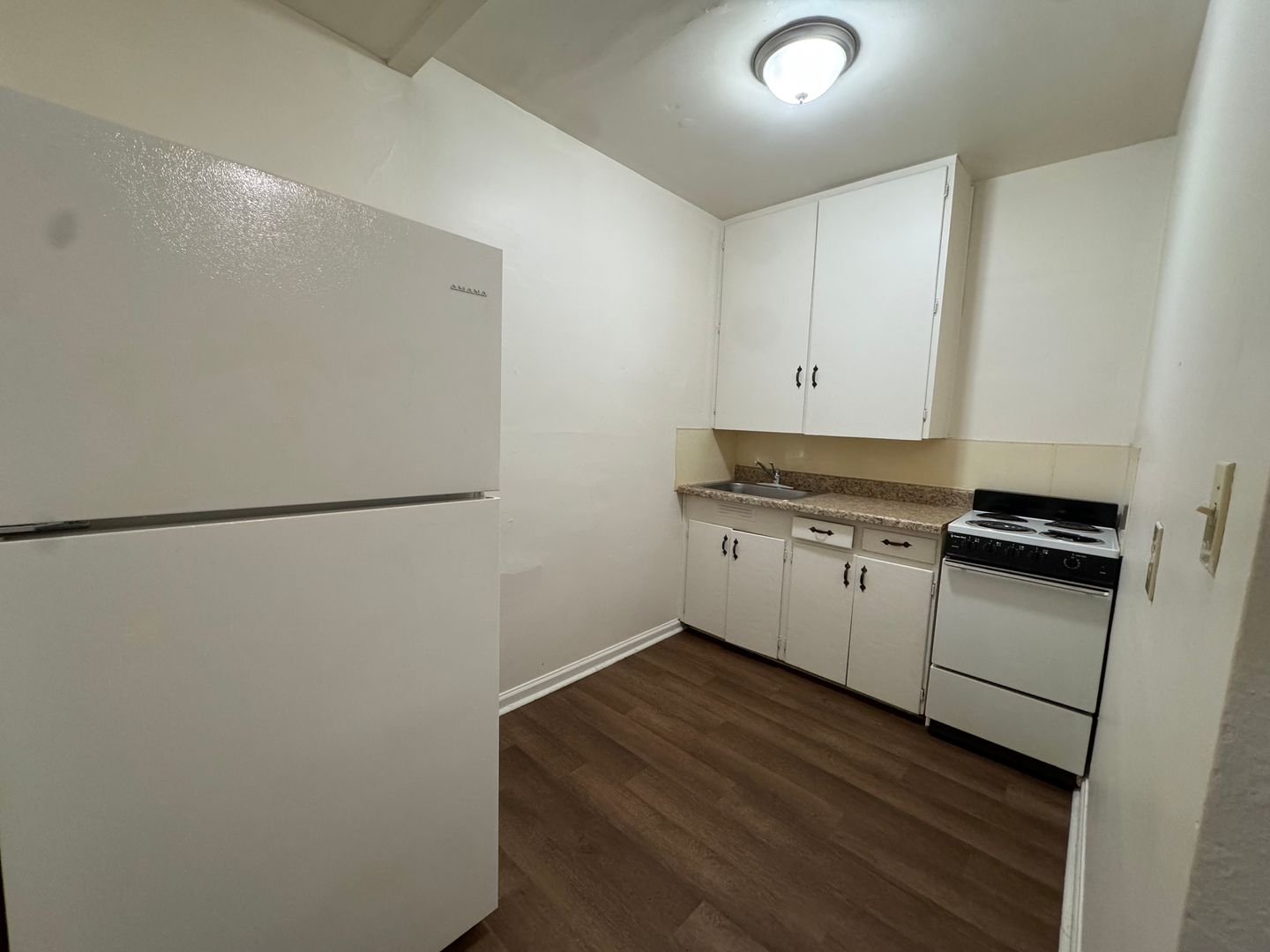 This is an upstairs studio apartment located above Tim’s Appliance on the corner of Harvard and Fairhaven. The living area features hardwood floors, and the kitchen comes with a refrigerator and stove. A window A/C unit is included to help keep the space comfortable. Coin-op laundry is available downstairs for added convenience.